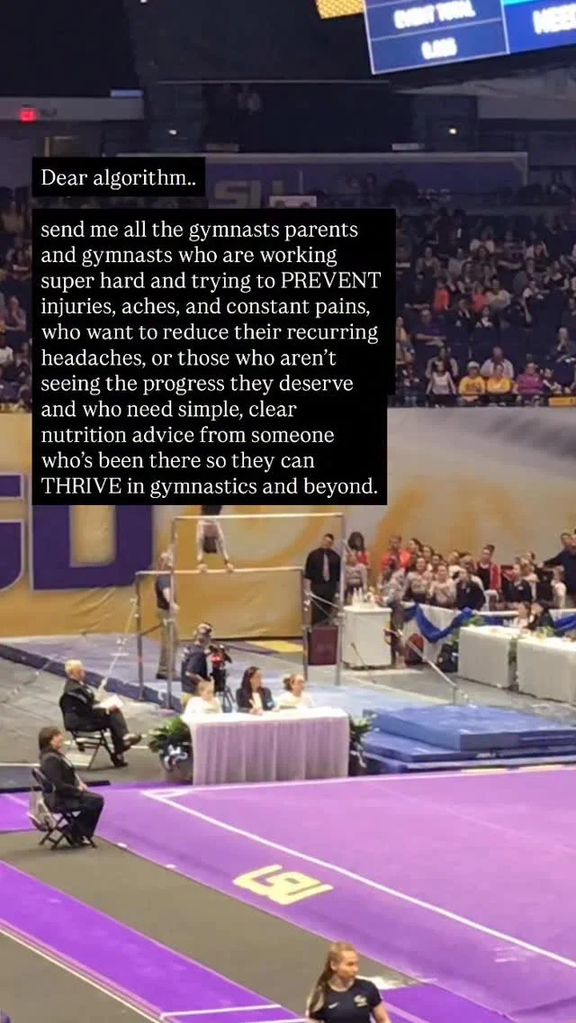 Helping gymnasts and gymnasts parents fuel for optimal health, performance, and longevity in the sport—while ensuring a positive relationship with food and body image. I guide gymnasts in developing sustainable habits that last beyond gymnastics and work to prevent the underfueling struggles I experienced.